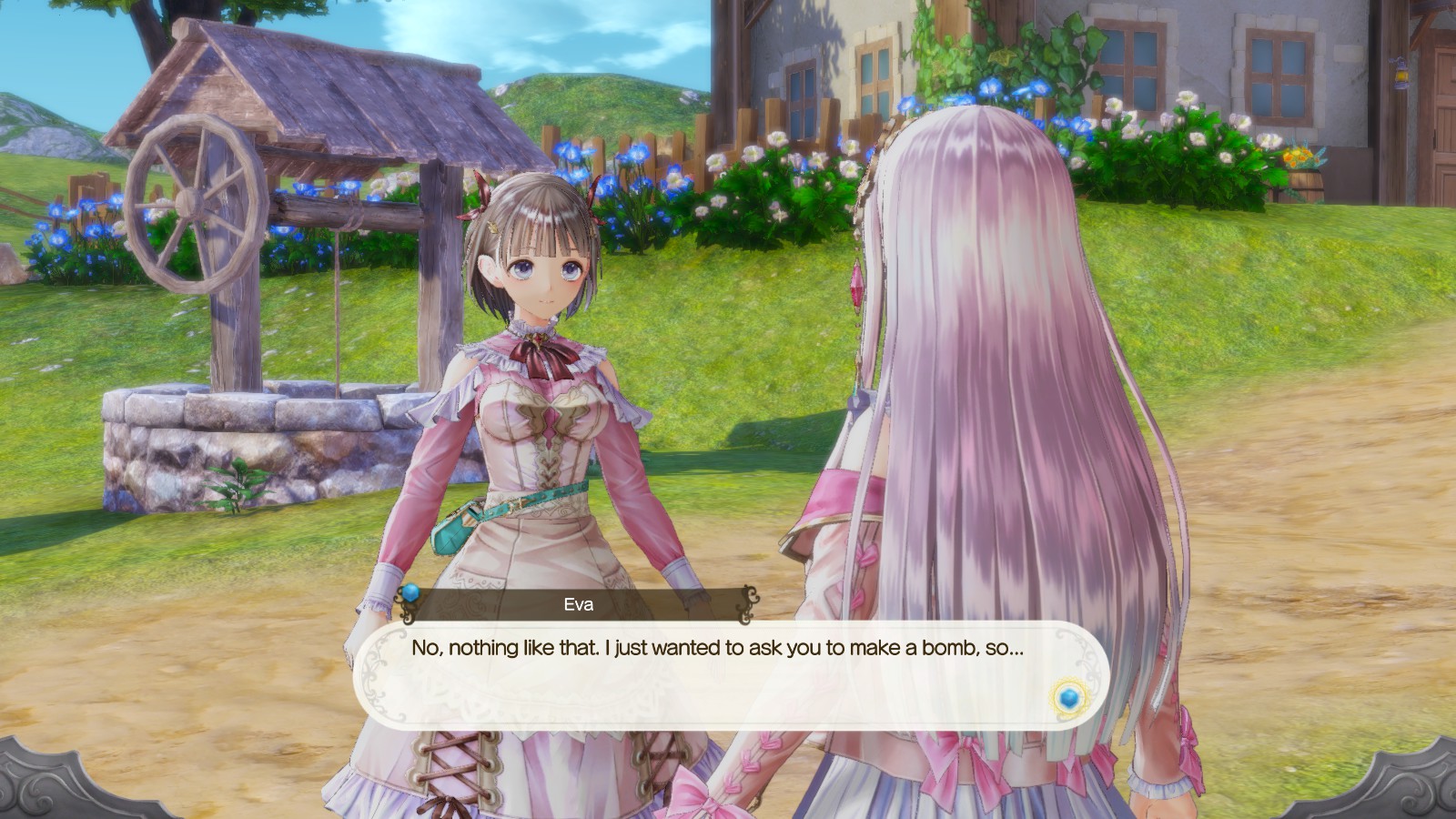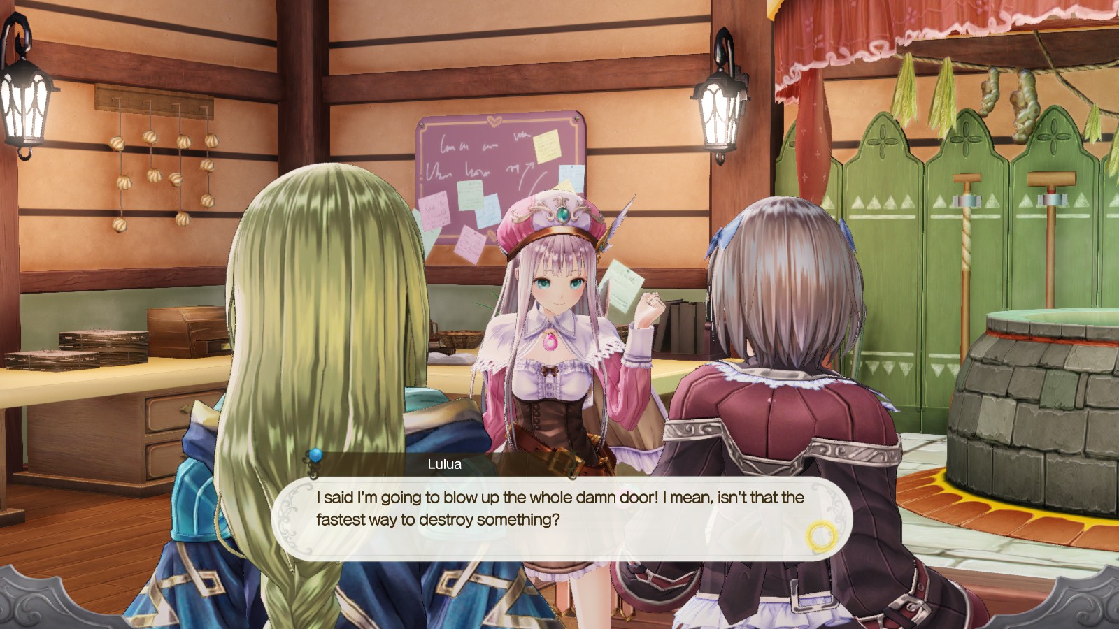 I have to say, I’m really digging that they’ve finally figured out how to create good pacing without the time limits of the older games. It’s a heresy to some, but I really dislike the time limits, as they are so contrary to the general relaxed feel to the games. But without any time limits, the game designers were floundering for a while with the games’ pacing. Atelier Sophie was a mess in this regard: there’s no threat, or really a plot at all, until suddenly there is, but don’t worry about it, it’s super urgent and the world’s dying and all, but don’t let that stop you from leveling up your friendship with the fatty. Atelier Firis brought back a timer, but it was so generous it really didn’t matter; even I, who go about things rather lackadaisically, still had to just fill time with stuff before that timer ran out. And it was only for the first part of the game: after that, you’re free entirely to go your own pace. But there were still some issues with filler time and such. Atelier Lydie and Sue was even better with pacing, and almost completely ditching the timer (there is one chapter with a generous timer), by having so many things going on that you don’t lack for things to drive you forward. However, progress slows considerably in late game, and honestly I just lost interest and didn’t finish it. Lulua seems to have finally gotten it right – story progression is based on skill progress, which drives events. You have to do stuff to beef up your skills, which gives you things to do. Then you advance in the story, have more things to do, have to build up your skills more, etc.